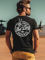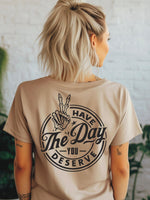 Step into the world with a blend of cheeky attitude and bone-chilling style with our "Have the Day You Deserve" t-shirt. Featuring a skeleton hand confidently flashing the peace sign, this shirt carries a dual message: a wish for peace and the subtle nudge to reflect on one's actions. Perfect for those who appreciate a bit of dark humor, this tee is a reminder that our days are often what we make of them. Made with comfort in mind and designed to turn heads, it's more than just a statement piece—it's a conversation starter.