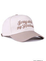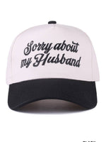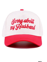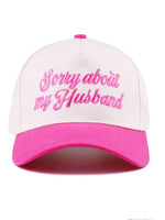 About My Husband Two Tone Canvas Cotton Cap SI-27994 -"SORRY ABOUT MY HUSBAND" TWO-TONE CANVAS -TRENDY DESIGN -ALL SEASONS -VERSATILE STYLE -ADJUSTABLE STRAP WITH METAL BUCKLE -LIGHTWEIGHT AND BREATHABLE MATERIAL -CIRCUMFERENCE: 22-25", BRIM: 2.35" Material: COTTON SI-27994 Sorry About My Husband Two Tone Canvas Cotton Cap (COTTON) ASH MOCHA-182669 BLACK-182670 LEOPARD-182671 PINK-183867 RED-183868 FUCHSIA-183869
