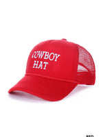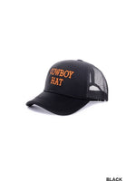 The Cowboy Hat Baseball Mesh Cap -COWBOY HAT EMBROIDERED -ONE-SIZE FITS MOST -MESH TRUCKER CAP -TRENDY WESTERN -BREATHABLE MESH BACK -ADJUSTABLE SNAP-BACK -WIDE AND VERSATILE USE -CIRCUMFERENCE: 22.4", BRIM: 2.35" Material: POLYESTER