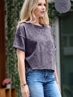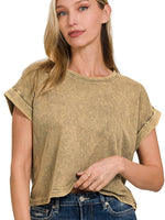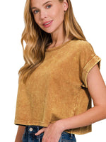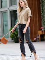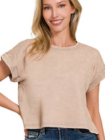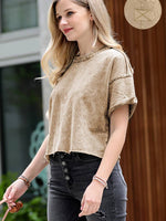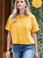 FRENCH TERRY WASHED RAW EDGE CROP TOP w/ back patch - RAW EDGE - CROP LENGTH TOTAL BODY LENGTH: 21", BUST: 46" approx. - MEASURED FROM SMALL Fabric Content: 100% COTTON