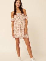 A floral-print woven mini dress with the following features: Drawstring halter neckline. Off shoulder sleeves. Smocked empire waist. Open back. Layered flare skirt. A-line silhouette. Model Info: Height: 5 ft 9 in | Bust: 31...
