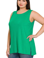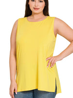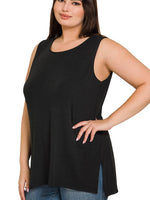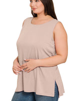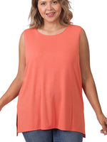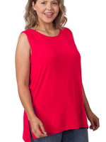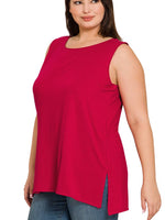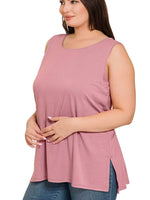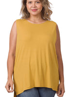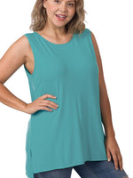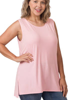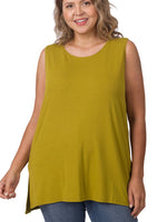 Plus Sleeveless Round Top - SIDE SLITS - HI-LOW HEM TOTAL BODY LENGTH: 29"(FRONT), BUST: 45" approx. - MEASURED FROM 1X Material: 57% POLYESTER 38% RAYON 5% SPANDEX Plus Size Clothing